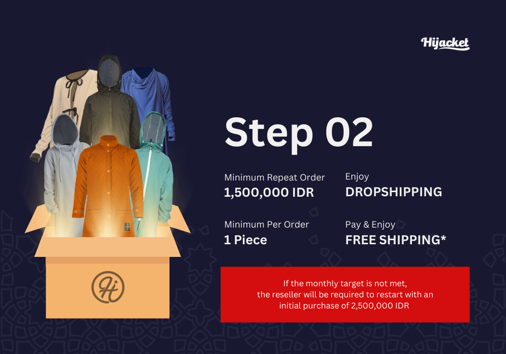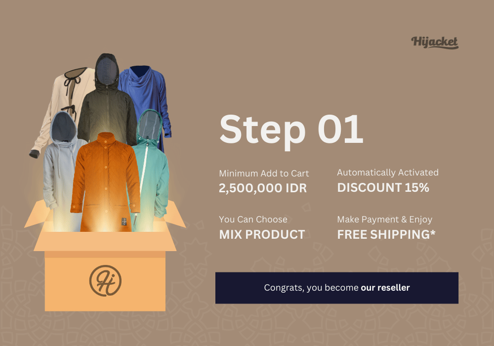 Masyaallah, menjadi reseller atau distributor Hijacket® sangatlah mudah dan cepat. Anda hanya belanja di website resmi Hijacket®. Dengan modal awal yang terjangkau dan proses pendaftaran yang cepat, Anda bisa segera memulai bisnis Anda sendiri dan mulai menjual produk Hijacket® di wilayah Anda.